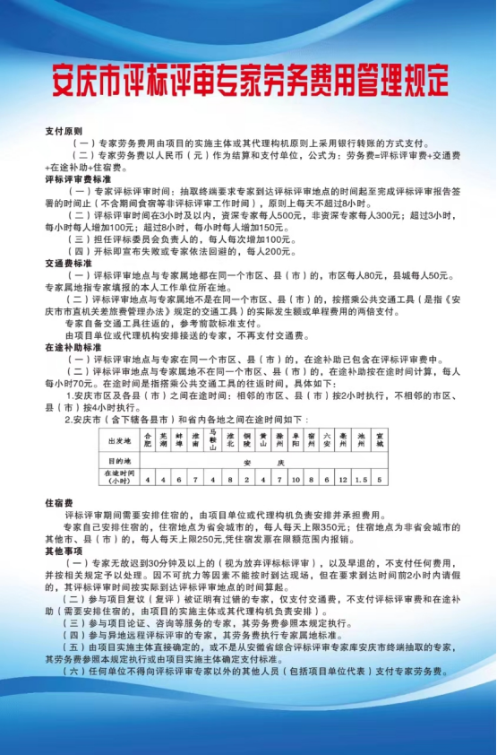 注:評審專家勞務費標準不低于《安慶市評標評審專家勞務費用管理規(guī)定》的2倍。具體金額根據(jù)需評審項目另行商定。